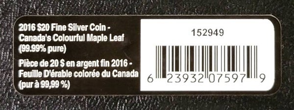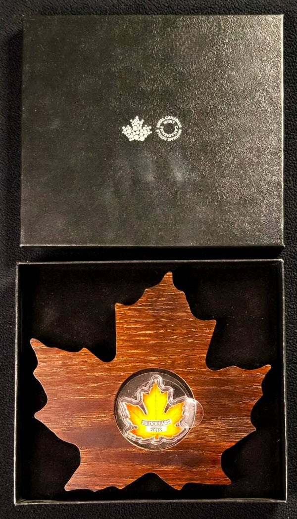 Discover the 2016 $20 Fine Silver Coin from the Canada's Colorful Maple Leaf Box Set, crafted from 99.99% pure silver and set in a solid wood maple leaf. This exquisite coin features vibrant maple leaf designs, making it a stunning addition to any collection. Perfect for collectors of fine silver and Canadian heritage items. Secure this beautiful piece today!