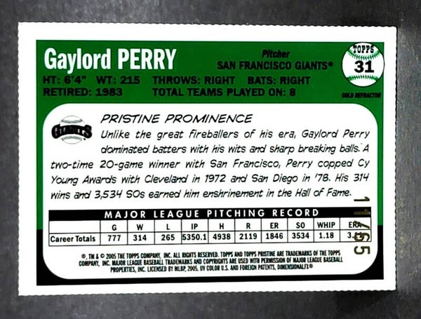 2005 Topps Pristine Legends Gold Die Cut Refractors #31 Gaylord Perry Collectible Sports Trading Card